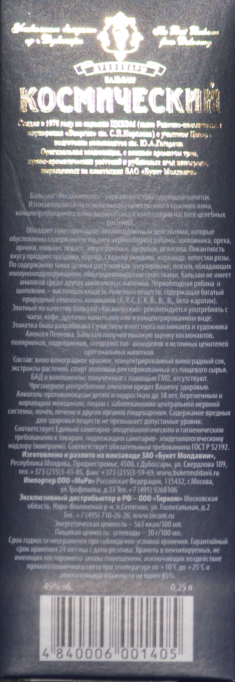 В бальзаме «Космический» уникально все. Крепкий тонизирующий напиток, создан в 1976 году по специальному заказу Центра подготовки космонавтов, по рецептуре разработанной Институтом питания АН СССР, и в открытой продаже появился только в 2000 году. Изготавливается на основе концентрата виноградного сока и целебных растений с использованием народных рецептов настоек и лекарственных снадобий. Тонизирующее действие обеспечивают входящие в его состав настои элеутерококка, левзеи, арники, ореха молочно-восковой зрелости, шиповника, черноплодной рябины. Оригинальные вкусовые качества напитка проявляются при добавлении его в чай, кофе, безалкогольные и другие напитки.